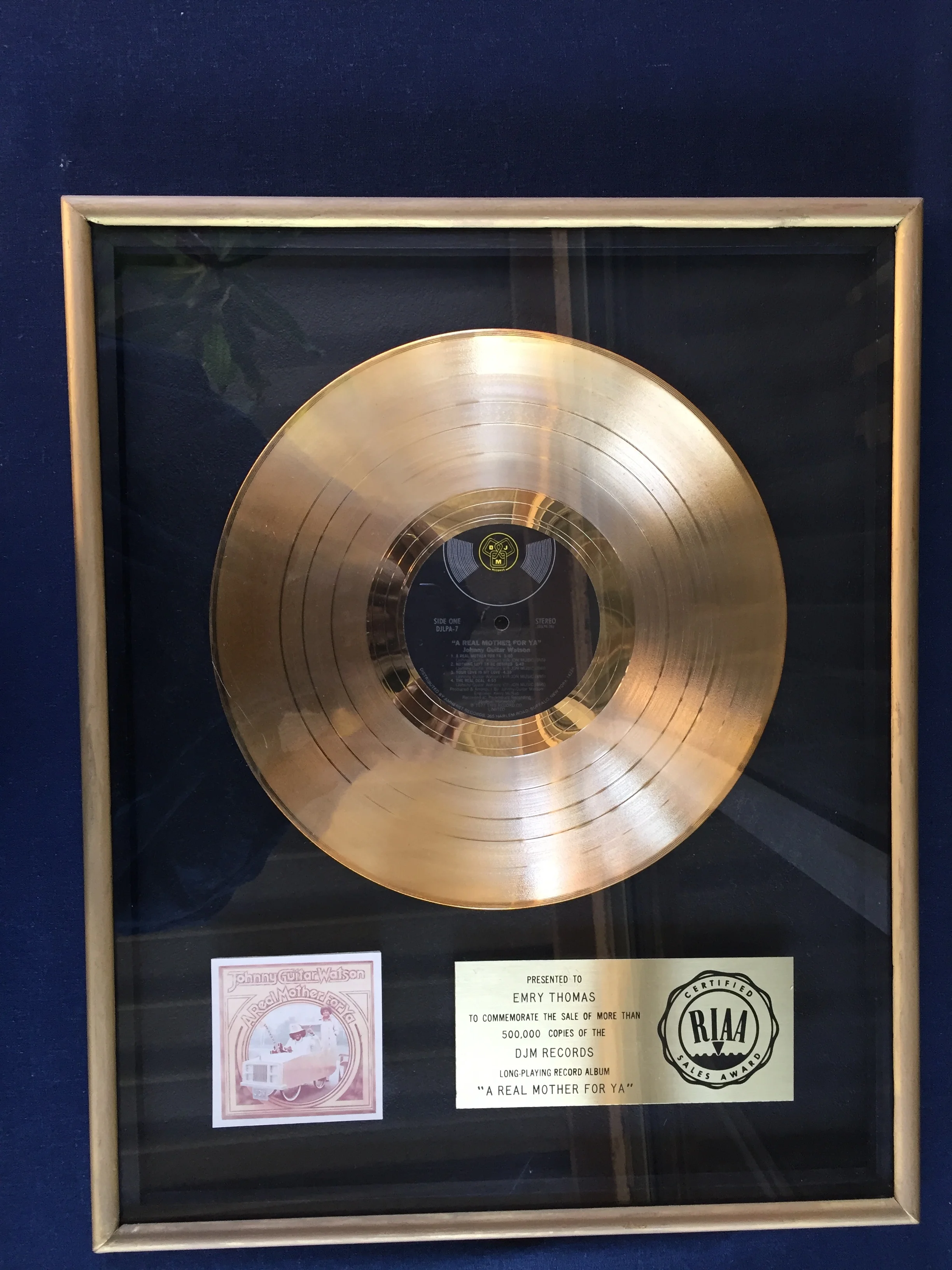Presented to Emry Thomas to commemorate the sale of more than 500,000 copies of “THE REAL MOTHER FOR YA”
