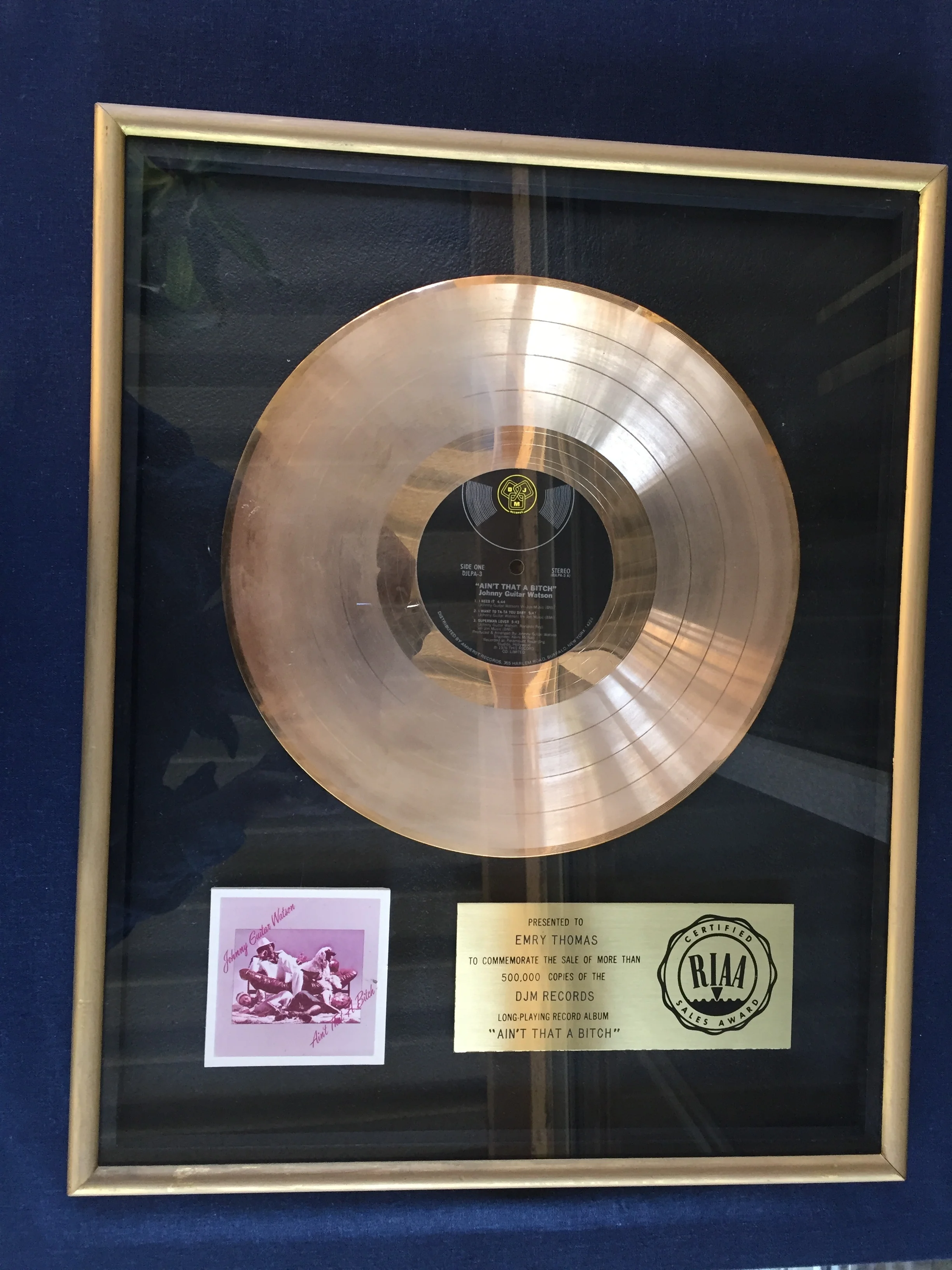 Presented to Emry Thomas to commemorate the sale of more than 500,000 copies of DJM Records “AIN’T THAT A BITCH”